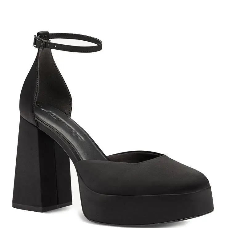 Zapato de tacón elaborado en textil. Tacón de bloque de 9,5 cm de altura. Cierre con fina pulsera con hebilla en el tobillo. Suela de goma con plataforma de 2cm de altura. Incorpora tecnología Touch-it que se adapta perfectamente a la forma del pie.