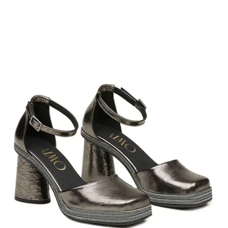Zapato tipo salón abierto elaborado en piel metalizada. Puntera cuadrada, detalle de banda trenzada de piel en el piso. Cierre ajustable con hebilla. Forro y plantillas acolchadas transpirables. Suela de caucho de 2,6 cm y tacón forrado en piel de 8,5 cm de altura.
