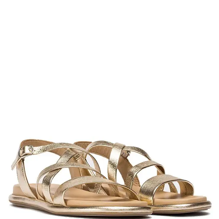 Sandalia plana de tiras entrelazadas de piel metalizada. Cierre ajustable con hebilla metálica. Plantilla de cuero. Suela de Cuerolite.