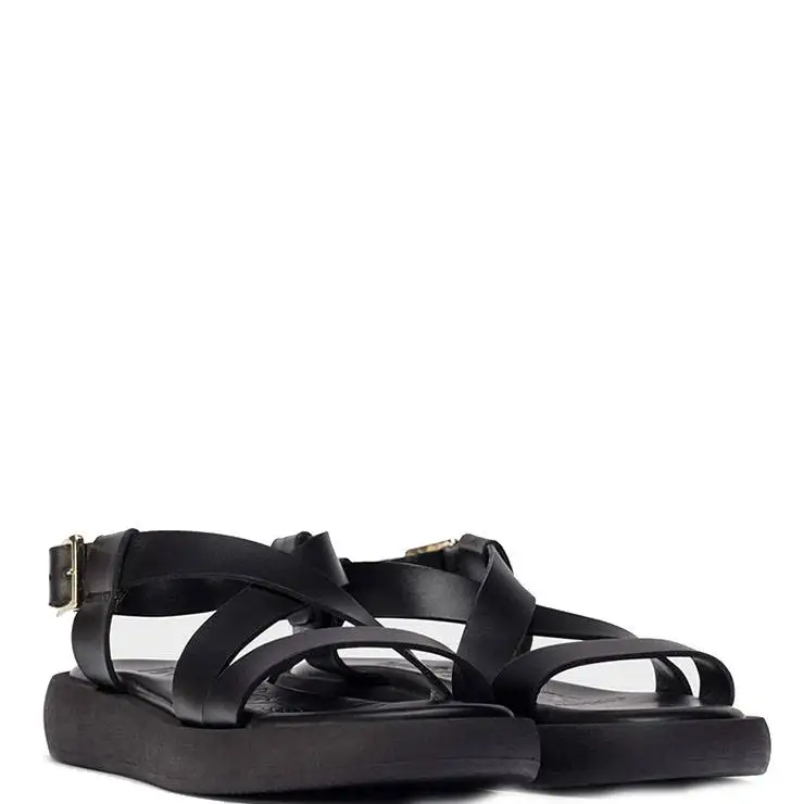 Sandalia planas elaboradas en piel lisa. Tiras entrelazadas simétricamente. Cierre con hebilla metálica. Plantilla interior de MemoryGel 3D. Suela TPU de 1,5 cm de altura.