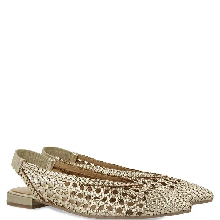 Bailarina destalonada elaborada en piel trenzada. Tira trasera elástica. Forro y planta de piel. Planta acolchada en látex. Tacón metalizado de 1 cm.