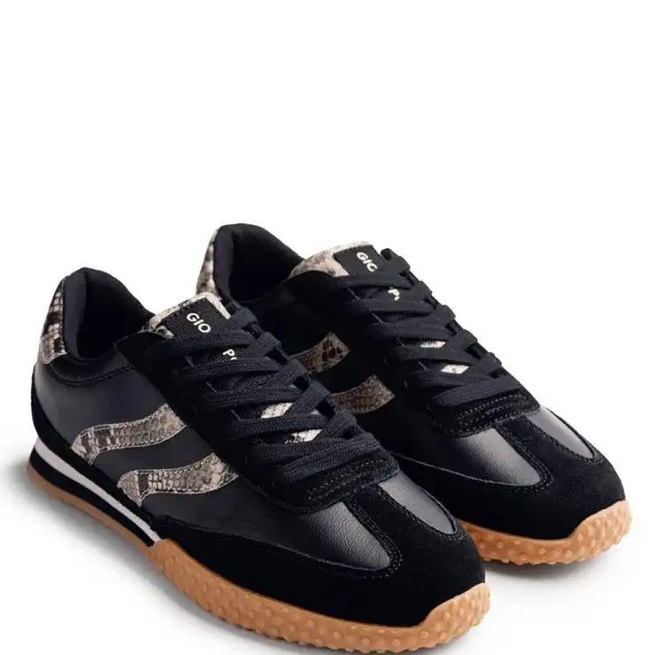 Zapatilla deportiva elaborada en serraje y PU. Detalles en animal print. Plantilla acolchada y extraíble de poliéster transpirable. Entresuela de goma EVA. Suela de TPR flexible de 2 cm.