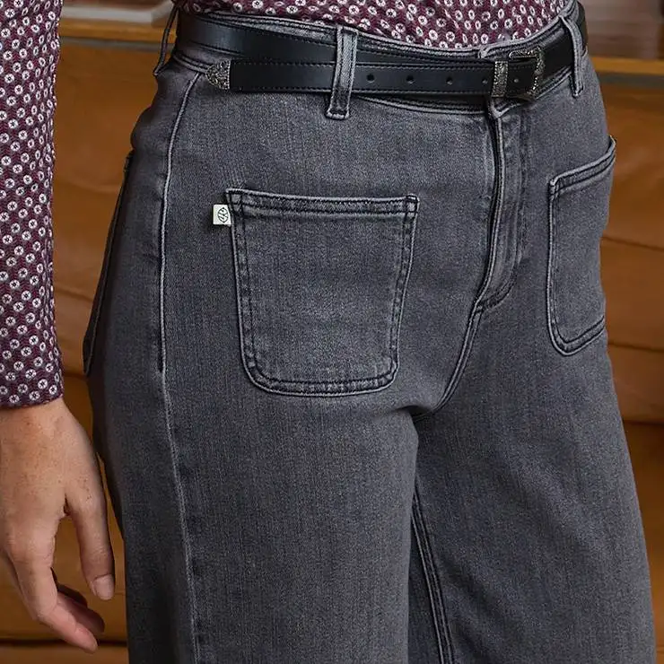 Pantalón tipo vaquero confeccionado en una mezcla de algodón y Tencel con un toque de elastano. Tiro alto y corte ancho. Bolsillos frontales.