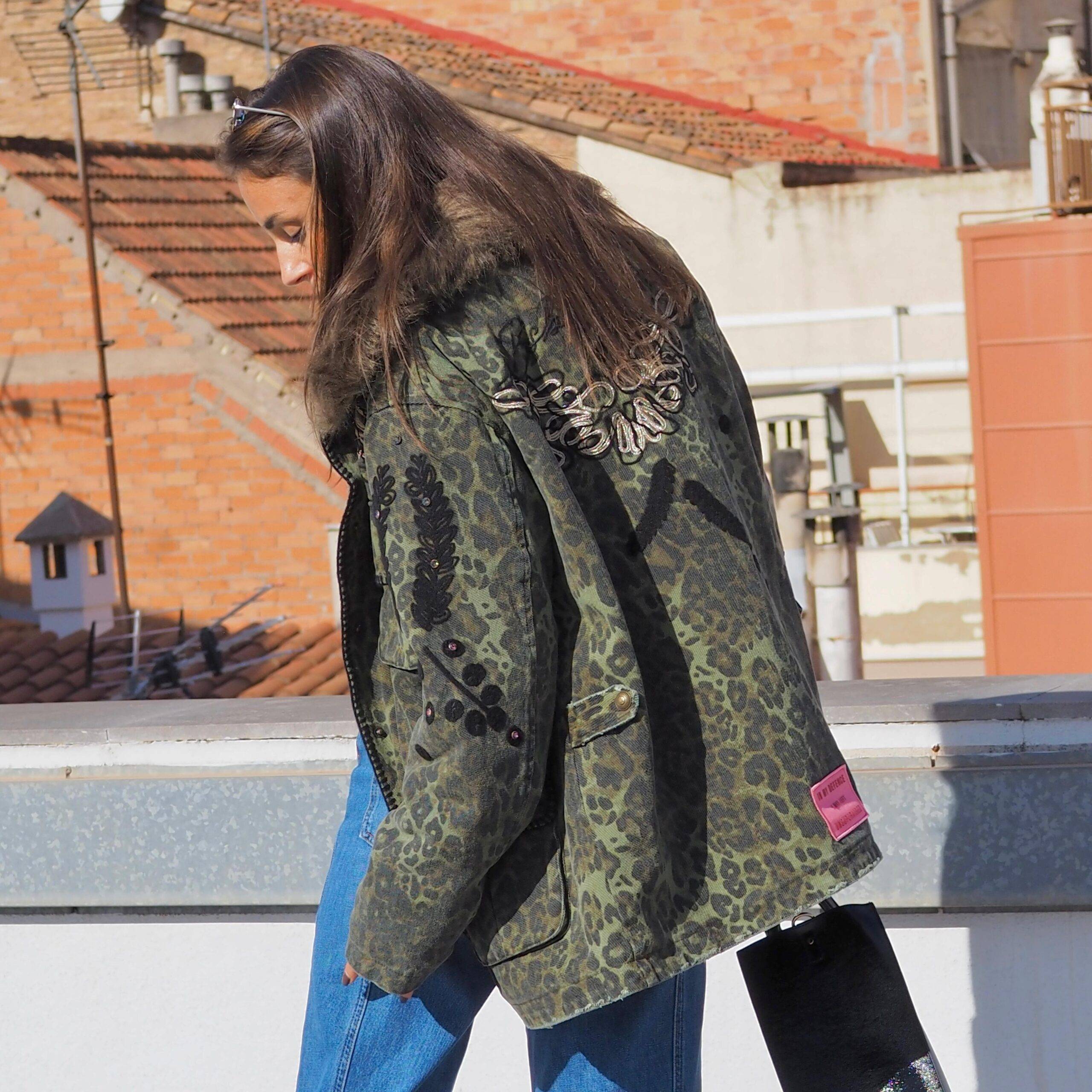 Chaqueta de algodón estilo militar con estampado de leopardo. Detalle de bordados y pedrería. Cuello de pelo sintético desmontable. Cierre con botones. Forro interior. Corte recto.