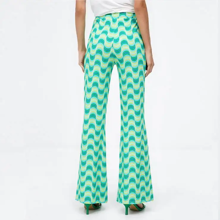 Pantalón largo acampanados desde la rodilla. Cintura alta. Confeccionado con tejido elástico muy cómodo. Estampado con ondas en verde y azul.