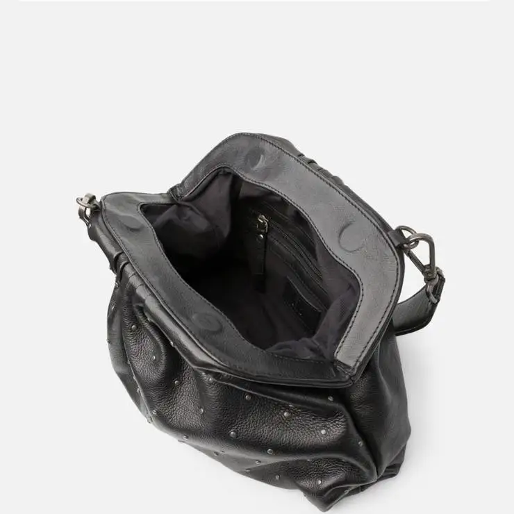 Bolso tipo bandolera de piel vacuna lavada. Detalle de tachuelas pequeñas en la parte frontal. Cierre boquilla con imanes. Asa de hombro extraíble. Bandolera regulable y extraíble. Bolsillos internos. Forro de algodón. Medidas: 21 x 34 x 6 cm