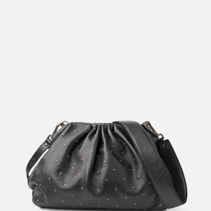 Bolso tipo bandolera de piel vacuna lavada. Detalle de tachuelas pequeñas en la parte frontal. Cierre boquilla con imanes. Asa de hombro extraíble. Bandolera regulable y extraíble. Bolsillos internos. Forro de algodón. Medidas: 21 x 34 x 6 cm