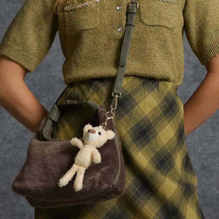 Bolso tipo bandolera de pelo con osito para colgar. Correa ajustable desmontable. Cierre de cremallera.