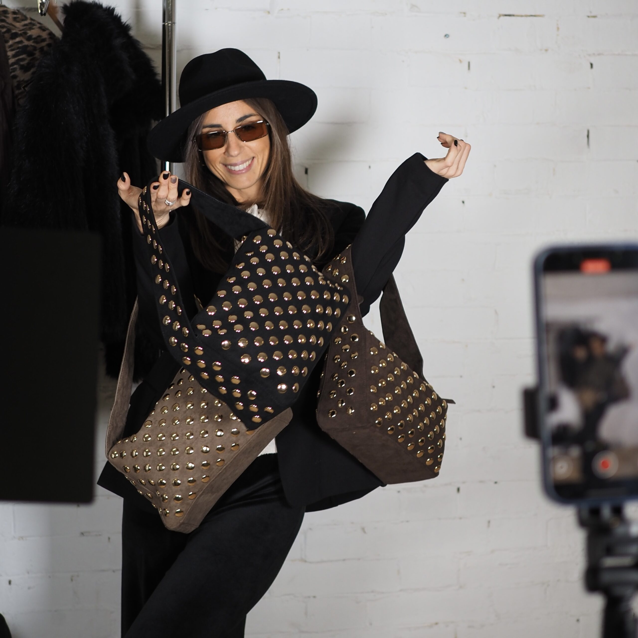 Bolso tipo shoulder de ante. Diseño cubierto de tachuelas redondas en dorado. Elegante y cómoda asa. Medidas 24x21x10 cm