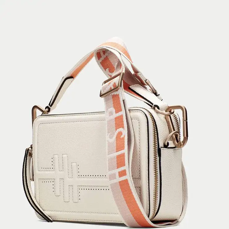 Bolso compacto tipo bandolera. Correa ajustable con herrajes metálicos dorados. Cierre con cremallera. Logo en relieve en la parte frontal. Medidas: 23x16x7 cm.