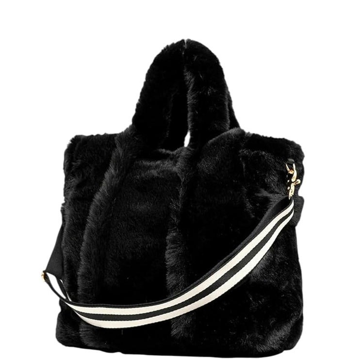 Bolso tote mini elaborado en peluche. Parche con logotipo en la parte delantera. Cómodas asas. Bandolera de grogrén a rayas ajustable y desmontable. Forro interior con logotipo. Se puede llevar al hombro o tipo bandolera.