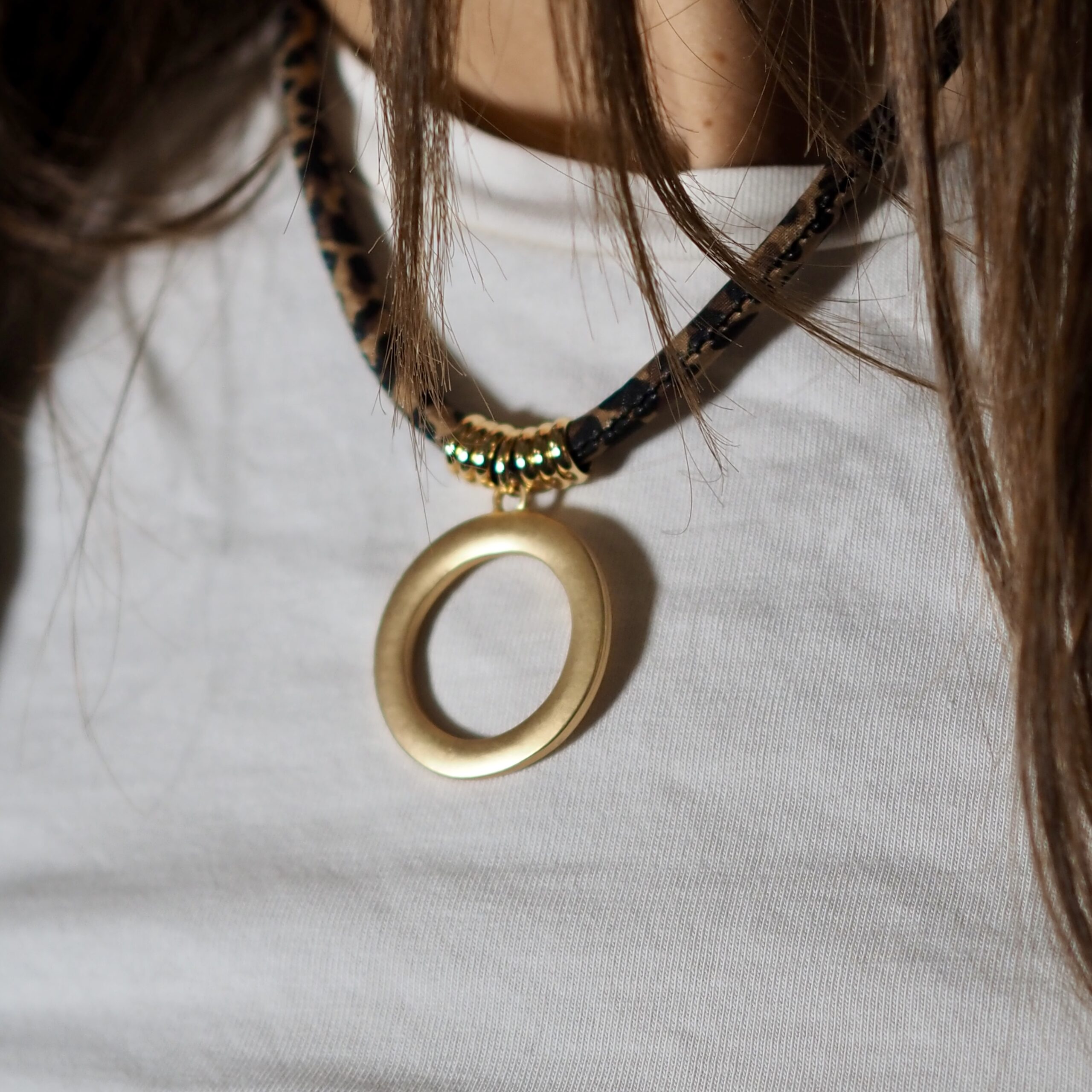 Collar de tejido en animal print. Detalle de circulo en color dorado. Cierre ajustable a diferentes medidas. Muy ligera.