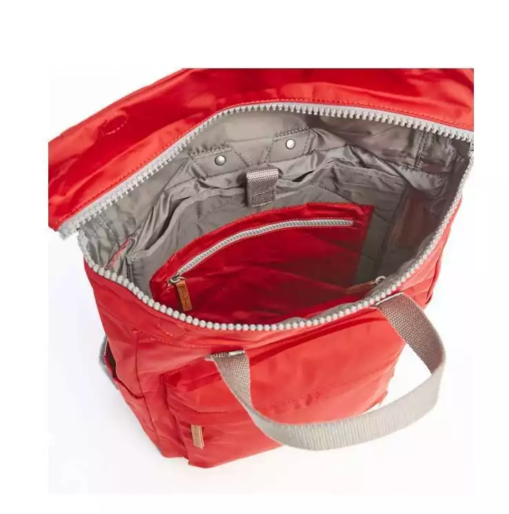 Mochila Roka de nylon reciclado de tamaño mediano con compartimento delantero y cremallera cubierta en color rojo. Resistente a la intemperie, duradero, elegante y está hecha de nylon reciclado que le da a la mochila un aspecto suave y muy moderno.