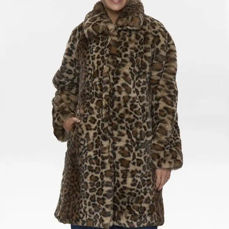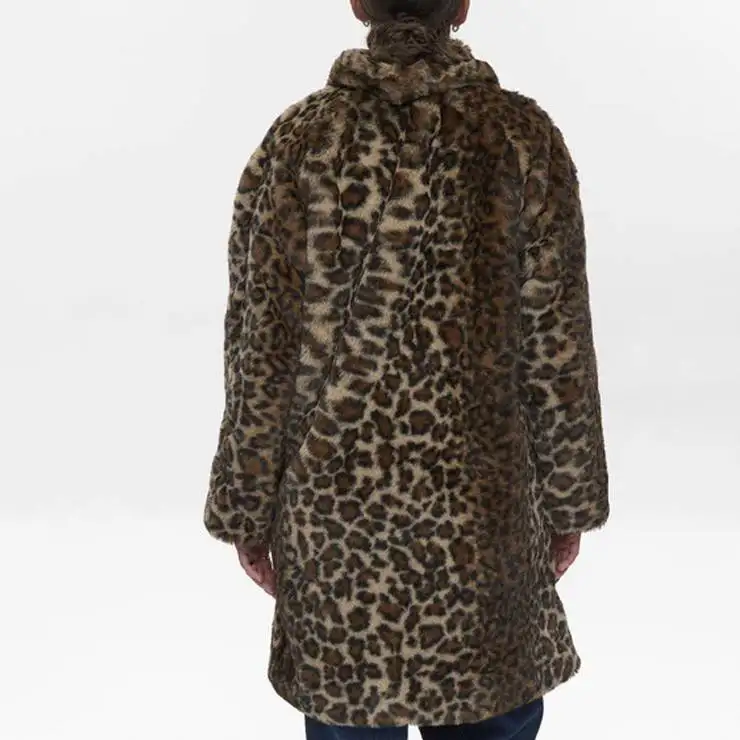 Abrigo de pelo sintético con estampado de leopardo. Cuello clásico, bolsillos delanteros y corte oversize.