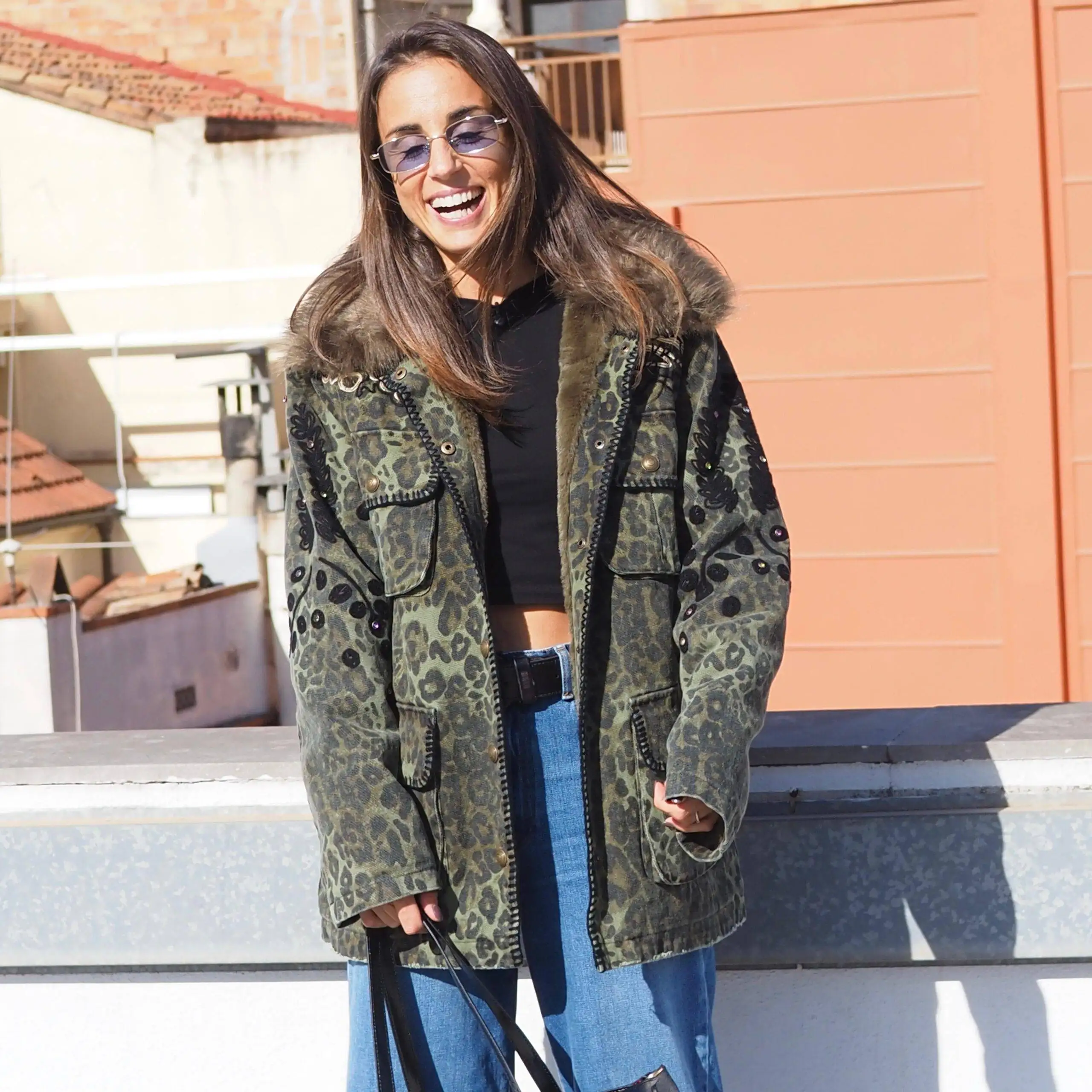 Chaqueta de algodón estilo militar con estampado de leopardo. Detalle de bordados y pedrería. Cuello de pelo sintético desmontable. Cierre con botones. Forro interior. Corte recto.