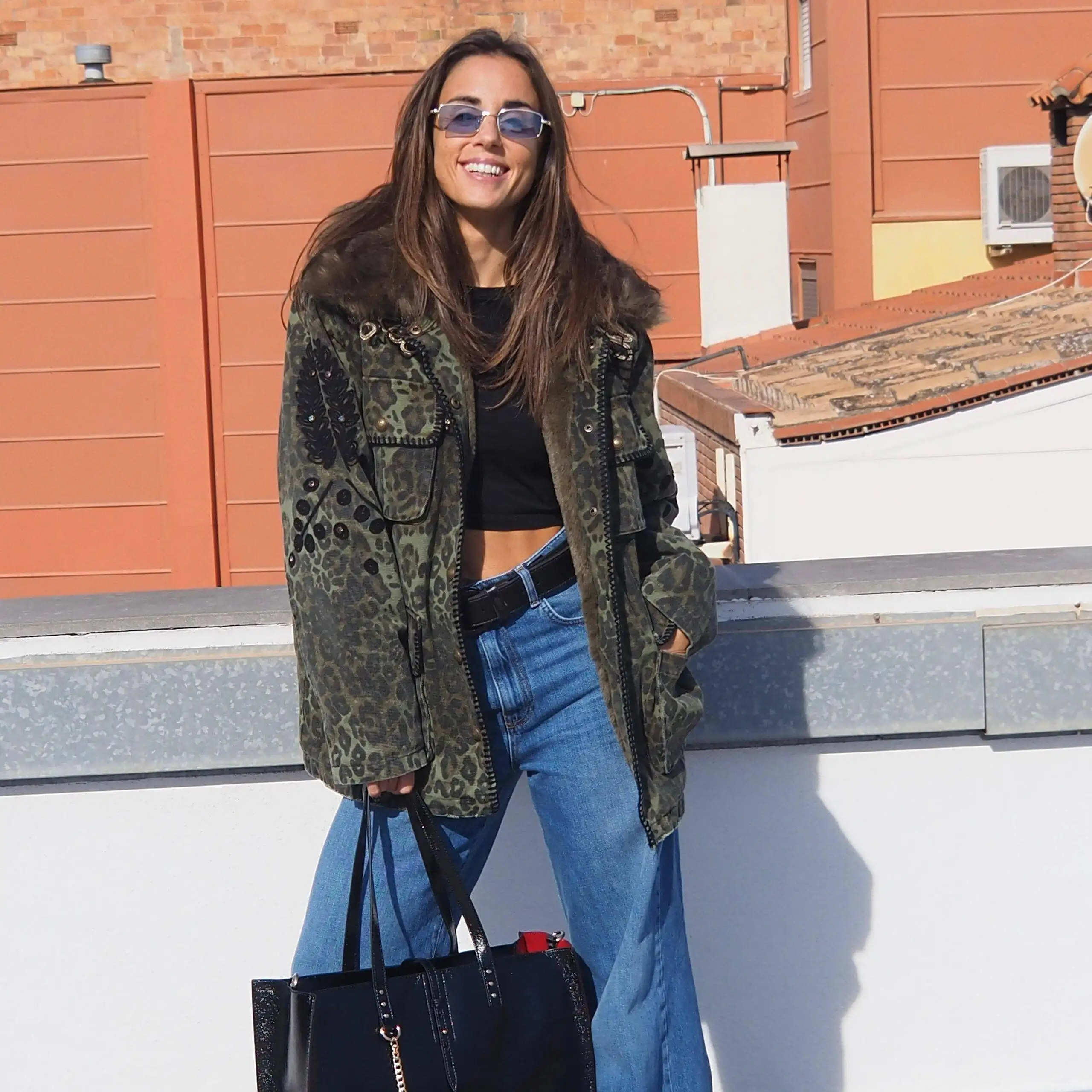 Chaqueta de algodón estilo militar con estampado de leopardo. Detalle de bordados y pedrería. Cuello de pelo sintético desmontable. Cierre con botones. Forro interior. Corte recto.
