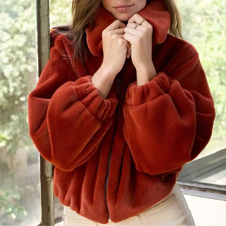 Chaqueta tipo bomber confeccionada en tejido peluche extra suave. Diseño sin forro. Cuello amplio y mangas abullonadas. Bajo elástico. Cierre con cremallera.