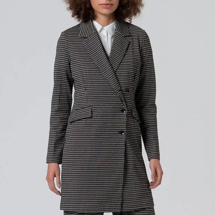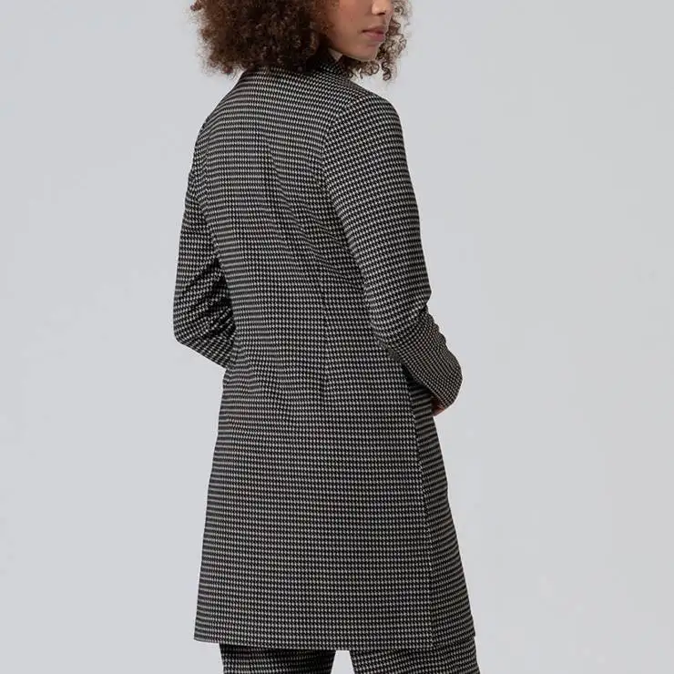 Chaqueta larga estilo blazer tejido elástico con mezcla de poliéster, viscosa y elastano. Estampado clásico de pata de gallo, corte entallado y cierre frontal con botones. Sin forro. Puede llevarse como vestido cruzado.