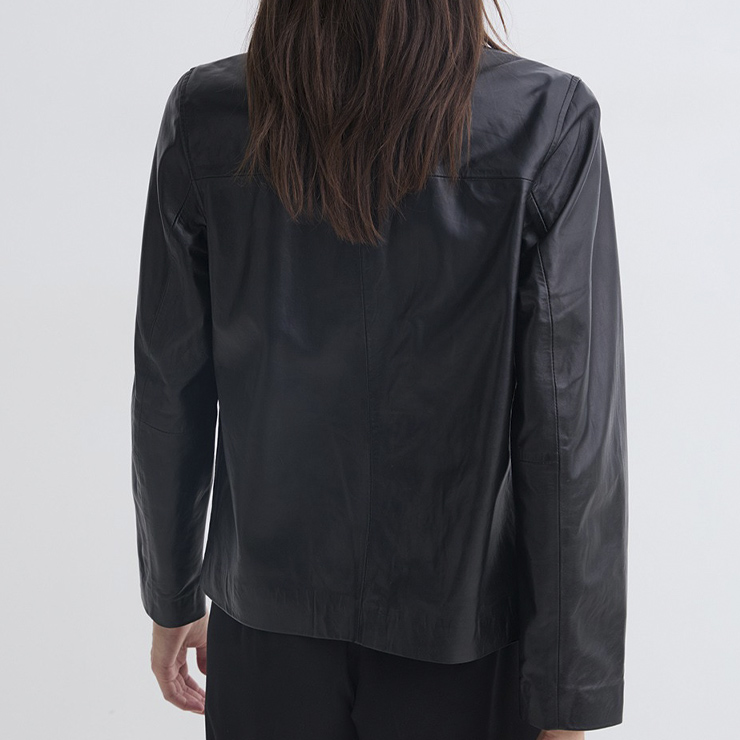 Chaqueta corta 100% piel de napa. Regular fit. Forro interior. Cuello camisero. Manga larga. Cierre con botones a presión bajo solapa. Un botón visible en cuello. Dos bolsillos de plastrón delante.