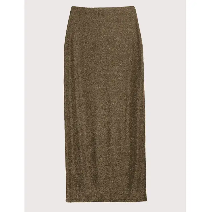 Falda midi confeccionada en mezcla de lúrex dorado y poliamida italiana. Lurex dorado en el exterior mientras que el interior está forrado de poliamida para esculpir delicadamente la figura, creando un look elegante y cómodo. Abertura lateral muy cómoda.