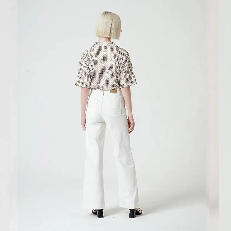 Pantalón largo denim de cintura alta y corte flare. Bolsillos delanteros y cierre frontal con botón y cremallera.