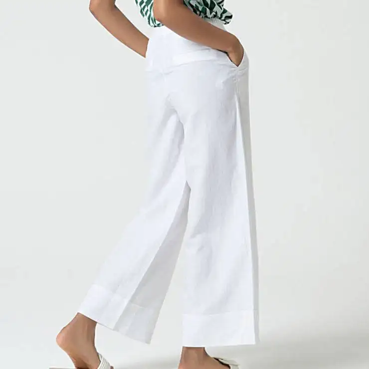 Pantalón ancho elaborado en viscosa y lino. Corte recto. Bolsillos delanteros y cierre frontal con cremallera. Detalle de vuelta en el bajo.