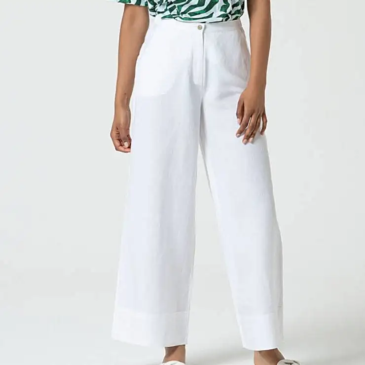 Pantalón ancho elaborado en viscosa y lino. Corte recto. Bolsillos delanteros y cierre frontal con cremallera. Detalle de vuelta en el bajo.