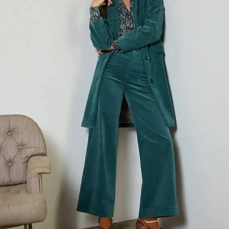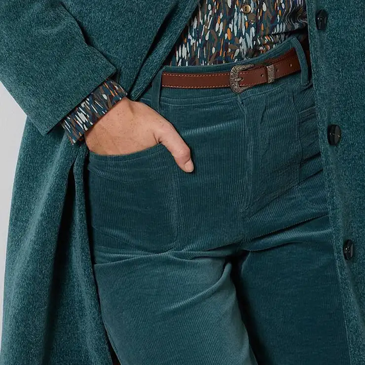 Pantalón de pana suave. Corte wide leg y tiro alto que estiliza la silueta. Bolsillos vistos en la parte delantera y trasera.