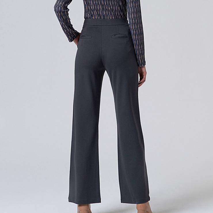 Pantalón ancho de corte recto. Sin cierres. Bolsillos y detalle de botón decorativo en la cintura.