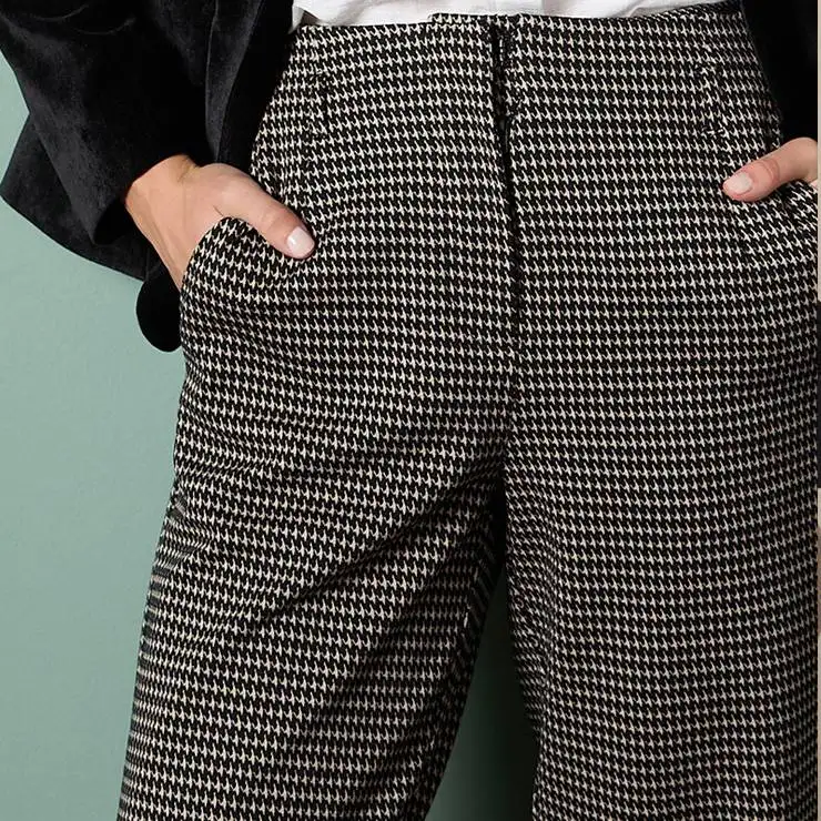 Pantalón en tejido elástico de corte recto con estampado pata de gallo. Cierre frontal invisible con botón y cremallera. Bolsillos laterales.