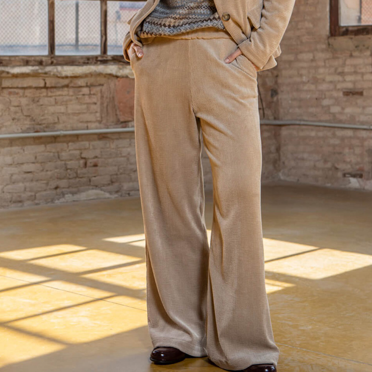 Pantalón ancho elaborado en pana elástica. Goma en la cintura. Bolsillos oblicuos.