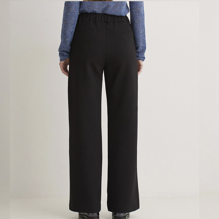 Pantalón elaborado en tejido mezcla de algodón cintura elástica. Corte ancho. Sin cierre. Botón decorativo. Dos bolsillos laterales y 2 bolsillos de vivo detrás.