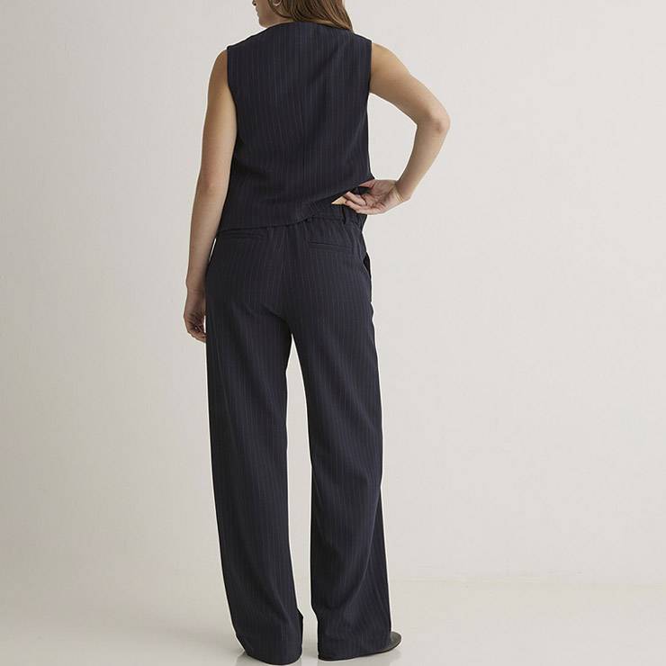 Pantalón wide leg en tejido Jacquard mezcla de fibras recicladas y viscosa. Estampado raya diplomática. Cierre con cremallera y gancho metálico. Con trabillas en cintura. Cintura con goma elástica detrás. Dos bolsillos laterales y 2 de vivo detrás.