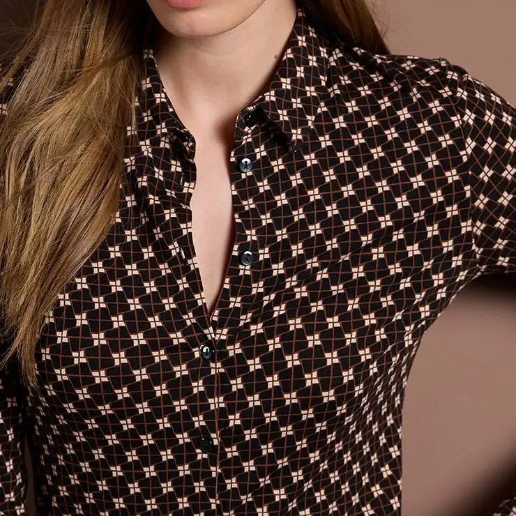 Camisa confeccionada en viscosa ecovero elástica. Corte recto y manga larga. Estampado geométrico.