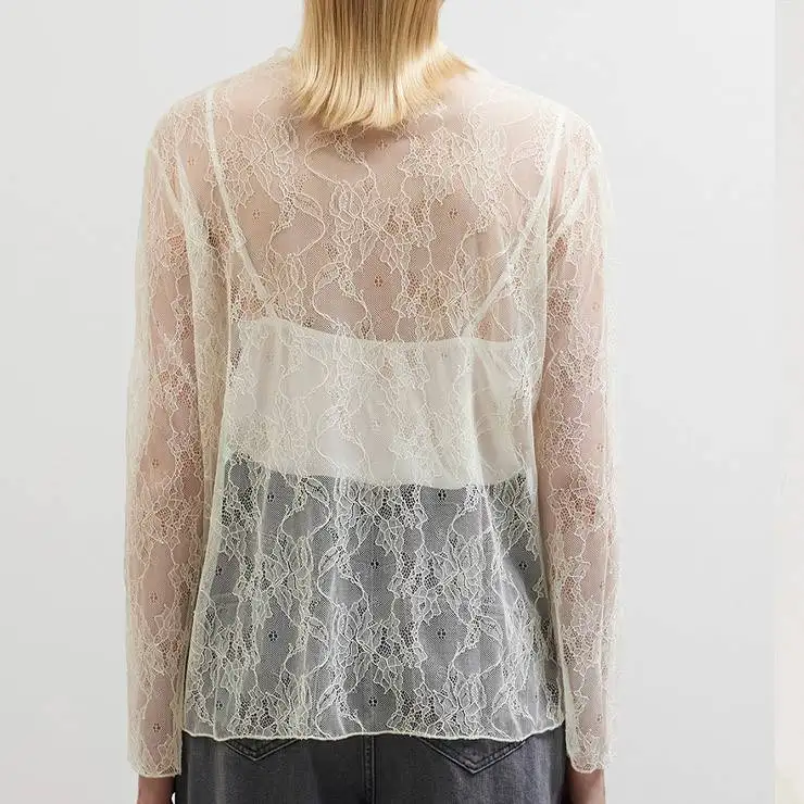 Camiseta transparente de encaje en poliamida. Mangas largas y escote recto. Diseño recto.