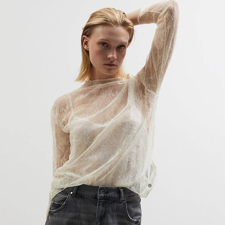 Camiseta transparente de encaje en poliamida. Mangas largas y escote recto. Diseño recto.