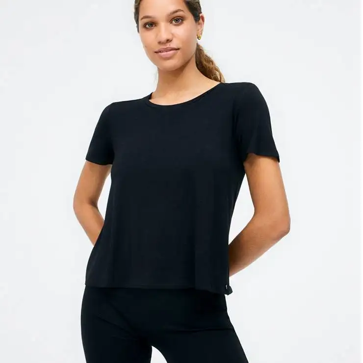 Camiseta de talle ancho y manga corta elaborada en viscosa elástica. Cuello escotado redondo. Tejido muy cómodo.