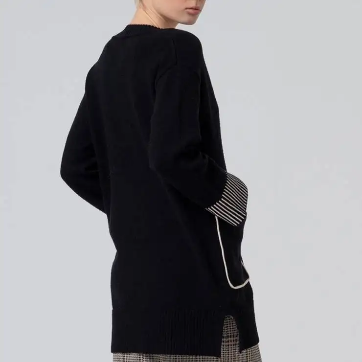 Chaqueta tipo cárdigan largo de tricot. Cierre de botones. Bolsillos de parche y vivos a contraste.