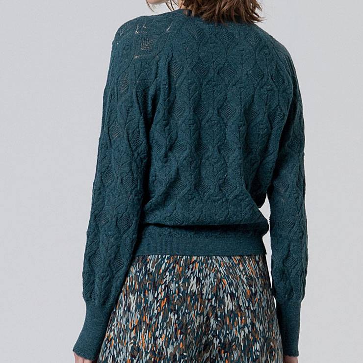 Jersey de punto fino confeccionado con una mezcla cálida de alpaca, lana, acrílico y nylon. Relieve original y sofisticado. Cuello redondo y corte relajado. Acabados suaves en puños y bajo.