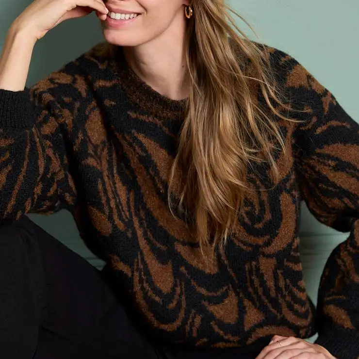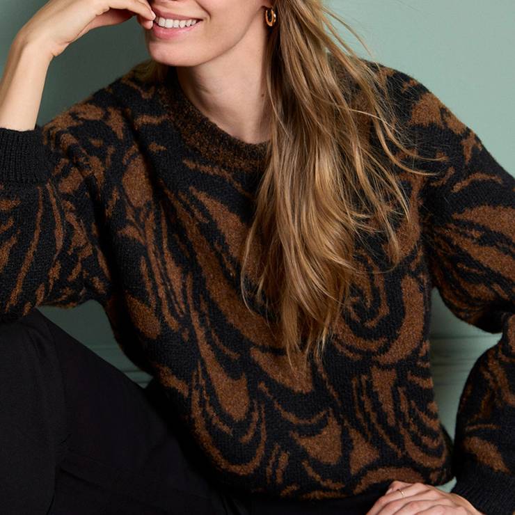 Jersey de punto grueso con diseño jacquard tipo swirl. Muy suave al tacto y con un ajuste cómodo. Tejido mezcla lana con poliéster reciclado. Cuello redondo. Canalé en puños.