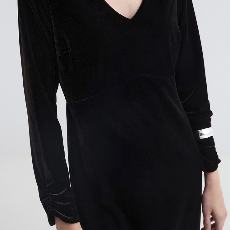 Vestido midi de terciopelo. Escote pico. Manga larga. Detalle fruncido en puños. Abertura en bajo lateral derecho.