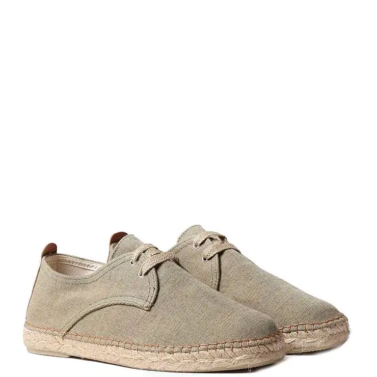 Alpargata con cordones elaborada en tejido de algodón y yute. Suela de yute con base de goma antideslizante. Plantilla interior forrada en algodón. La unión del tejido y la suela está cosida a mano con un hilo de algodón.
