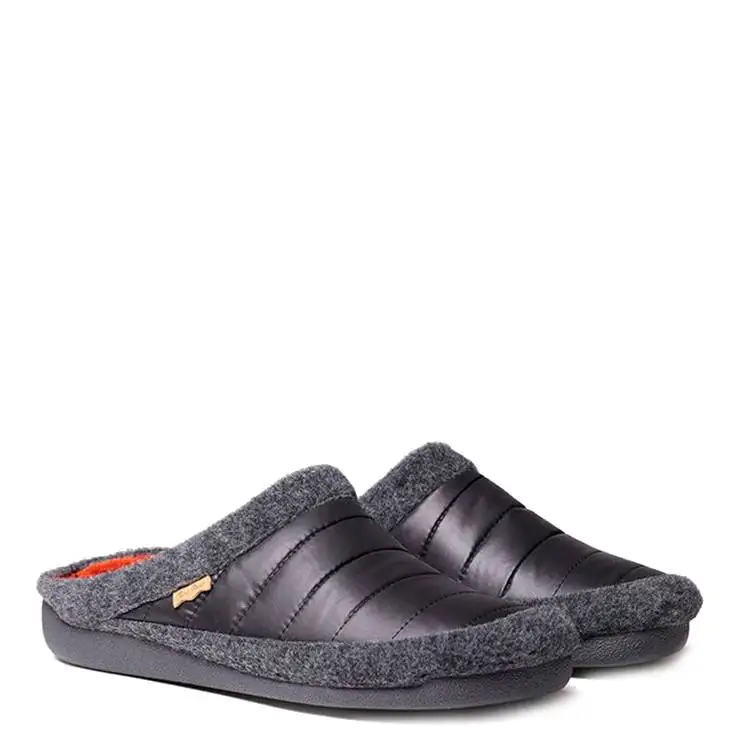 Zapatillas de la marca Toni Pons modelo Nordi-TK en color negro. Zapatilla de casa tipo zueco elaboradas en tejido acolchado y fieltro. Suela plana de goma y tiene 1,5cm de grosor. Plantilla extraíble con una cuña de 2cm de grosor en la parte del talón. Forro interior en tejido.
