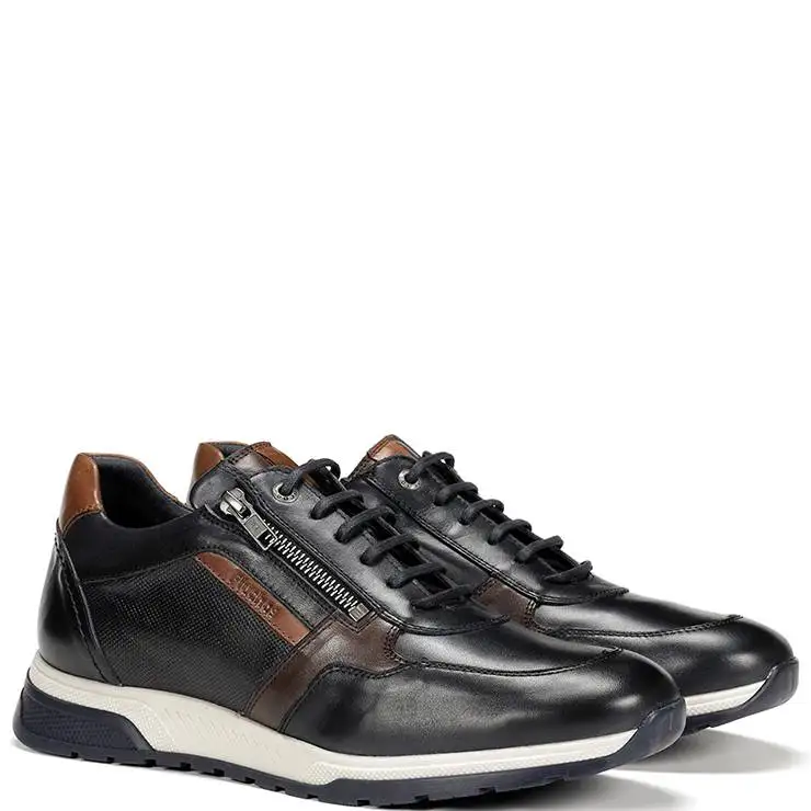 Zapato deportivo elaborado en piel. Detalle de costuras resistentes y diferentes tonos y texturas. Cierre con cordones y cremallera lateral.