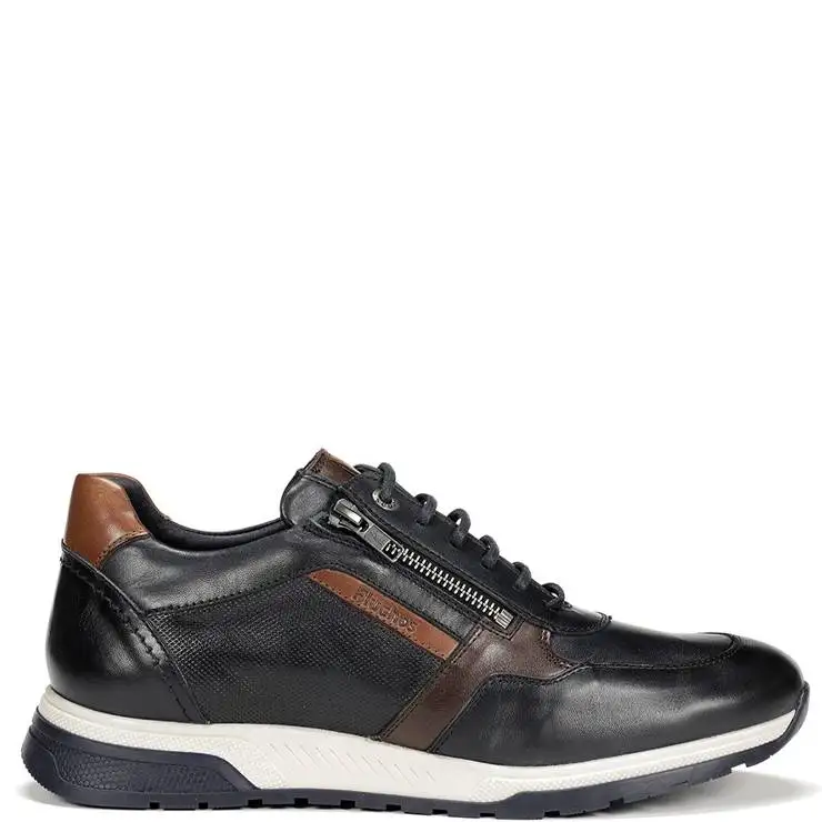 Zapato deportivo elaborado en piel. Detalle de costuras resistentes y diferentes tonos y texturas. Cierre con cordones y cremallera lateral.