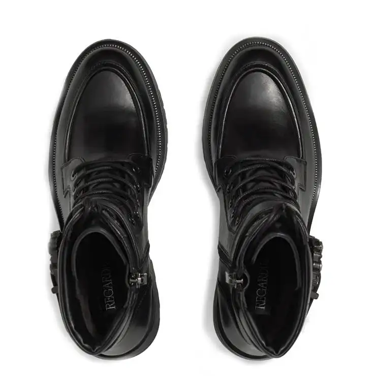 Bota tipo biker elaborada en piel. Forro interior de terciopelo. Suela de goma de 6 cm de altura. Cierre con cremallera lateral y cordonera central con cordones encerados. Detalle de hebilla con strass.
