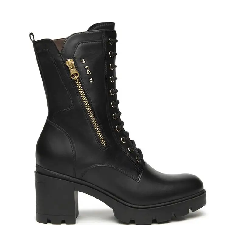 Botas estilo militar elaboradas en piel. Suela de goma con tacón bloque de 7 cm de altura. Cierre con cordones y cremallera lateral interna. Detalle de cremallera dorada decorativa.
