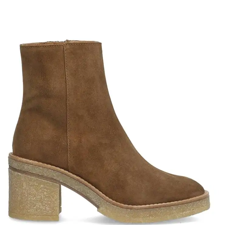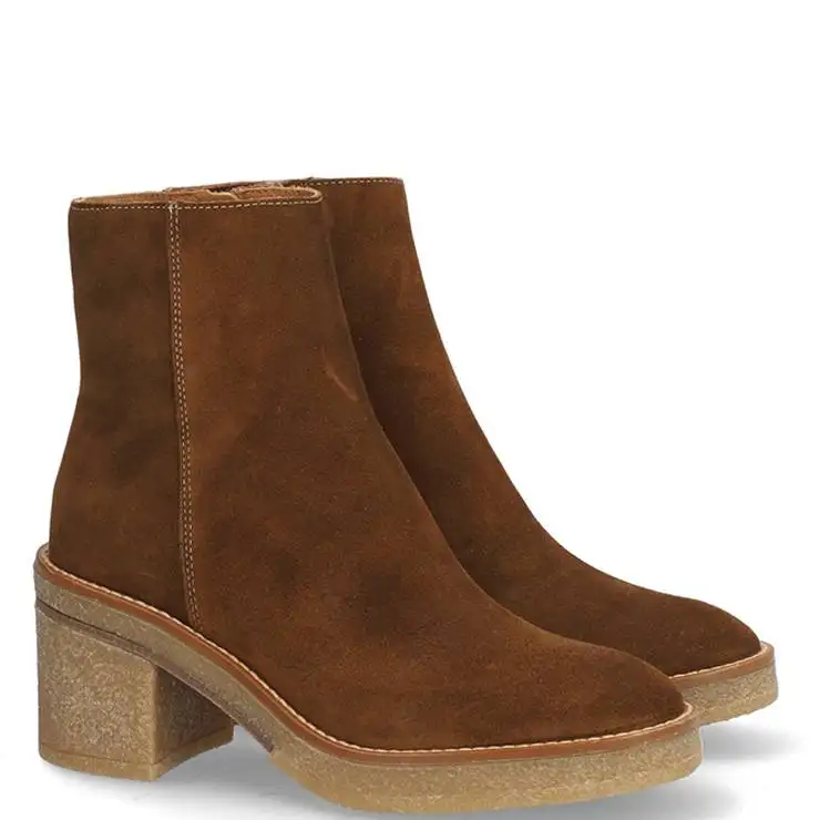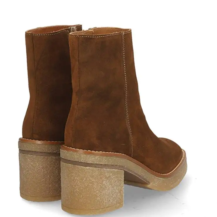 Botín de caña baja elaborado en piel nobuck. Suela crepe antideslizante y puntera redonda. Tacón de 7,5 cm. Cierre mediante cremallera lateral interna.