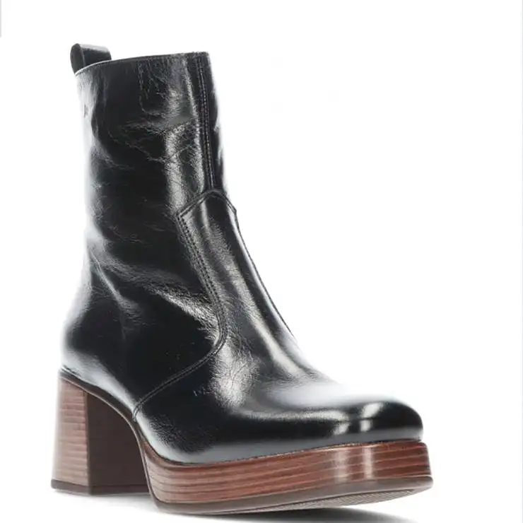 Botín de tacón elaborado en piel lisa con acabado de brillo. Suela de PU de plataforma de 2cm y tacón de 7 cm de altura. Cierre con cremallera lateral interna.