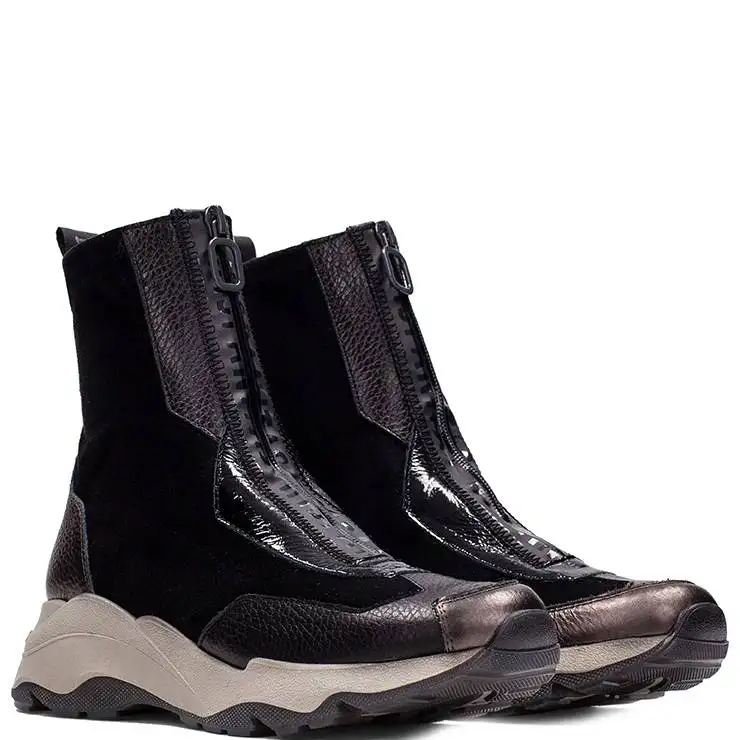 Botín deportivo elaborado en ante y piel. Suela de goma con cuña de 5 cm de altura. Cierre de cremallera en la parte frontal. Tirador trasero para facilitar el calce.